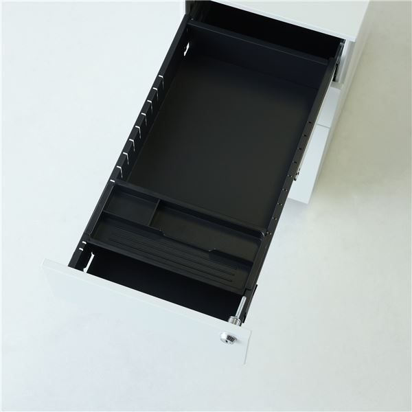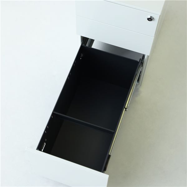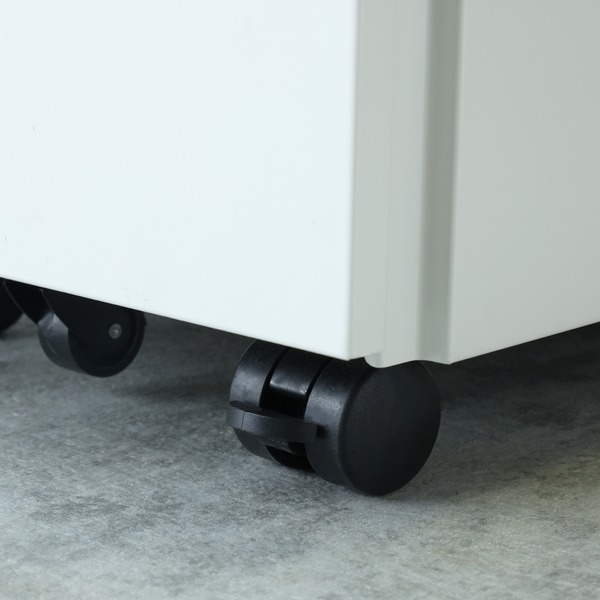 1段目施錠で前段施錠されるオールロック式。前倒れ防止のため1段目を開くと他の段はロックされます。ロック機能付きキャスター。