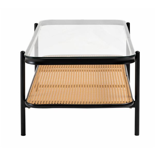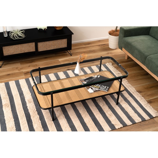 スタイリッシュさと落ち着いた雰囲気を兼ね備えたリビングテーブル。透け感のあるラタンとガラスが空間を広く見せ堅苦さのないモダンなリビングを演出します。