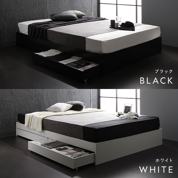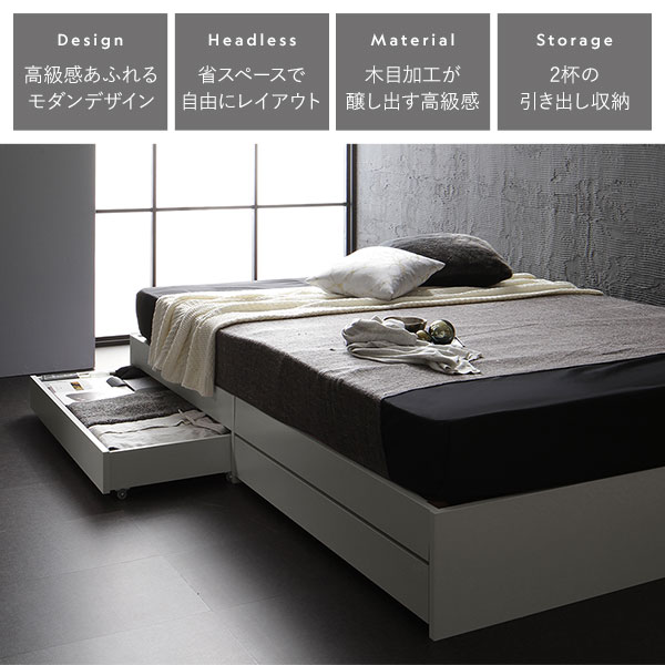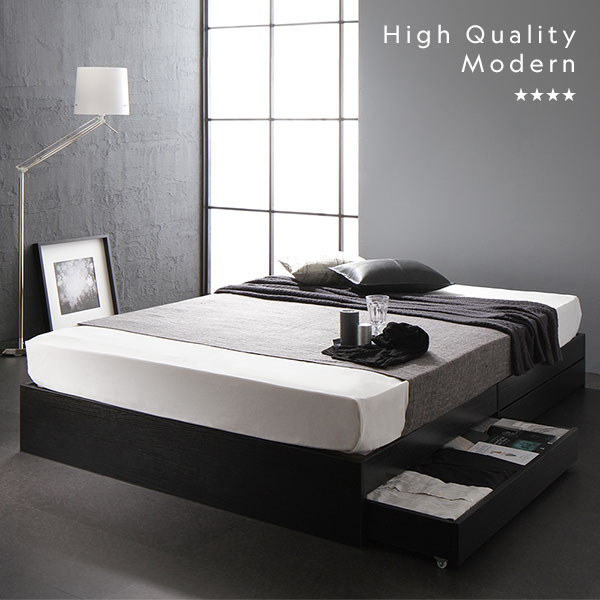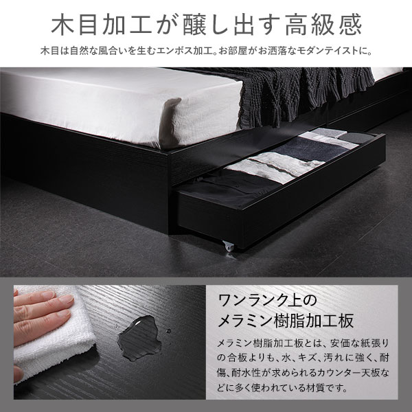 ベッド セミダブル 2層ポケットコイルマットレス付き ブラック 収納付き 引き出し付き 木製 省スペース コンパクト ヘッドレス シンプル モダン 組立品