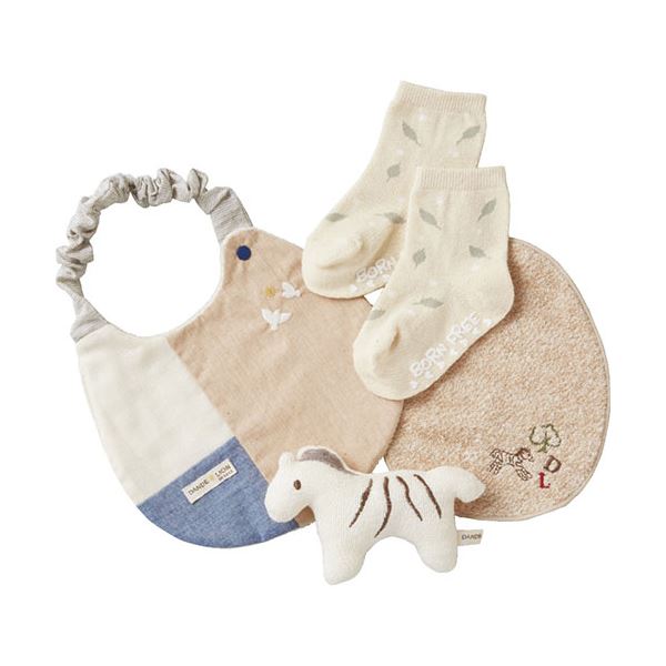 材質 : パッチワークスタイ : 綿100%、授乳スタイ : 綿100%(オーガニックコットン)、ガラガラ : 綿100%(オーガニックコットン)、(中綿)ポリエステル100%、リーフソックス : 綿(オーガニックコットン)・ナイロン・ポリウレタン