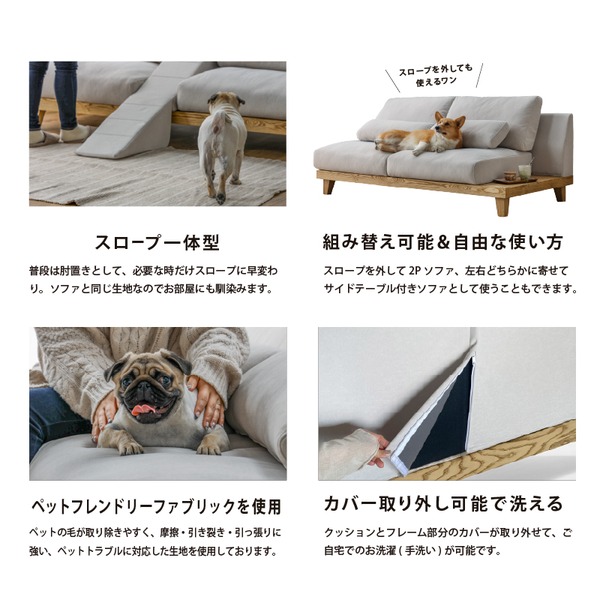 普段は肘置きとして、必要な時だけスロープに早変わり。ソファと同じ生地なのでお部屋にも
