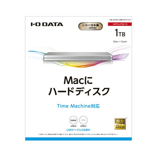 ●macOSのバックアップ機能「TimeMachine」に対応した1TB、シルバー×グリーンのポータブルハードディスク「HDPX-UTSC」です。