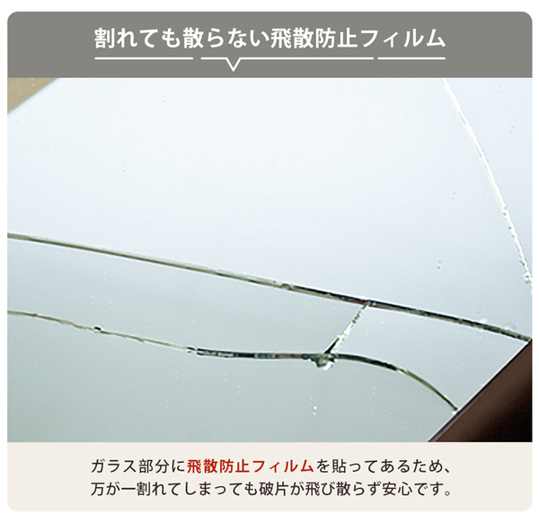 ミラー部分には飛散防止フィルムが貼ってある為、万が一割れてしまっても破片が飛び散らず安心です
