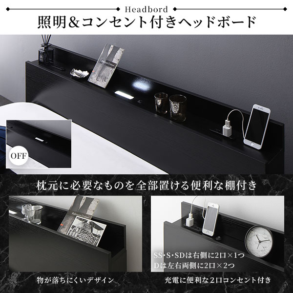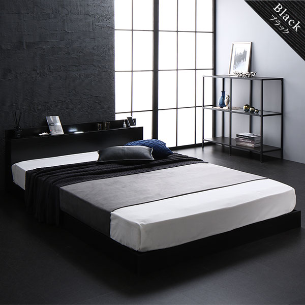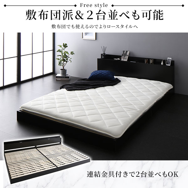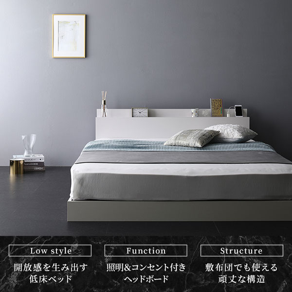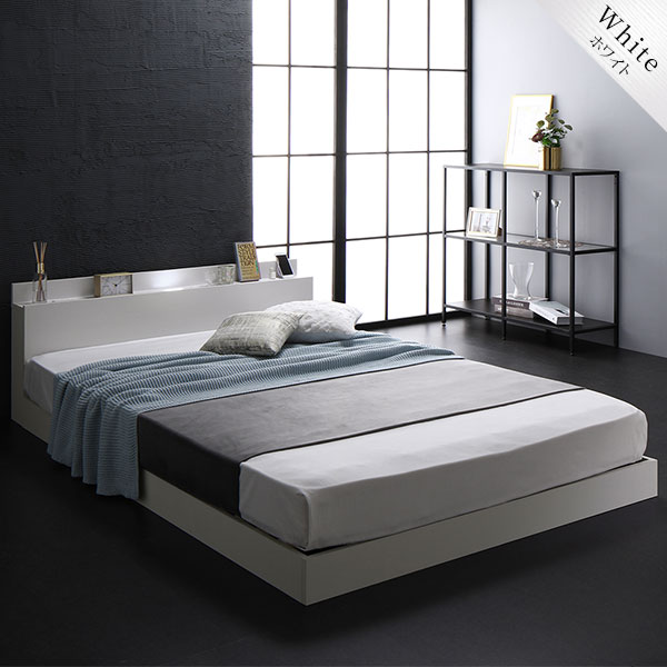 ベッド シングル 国産ポケットコイルマットレス付き(ハード) ホワイト ローベッド 低床 ロータイプ すのこ 木製 LED照明付き 棚付き 宮付き コンセント付き 組立品