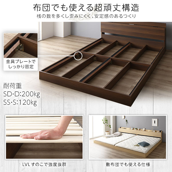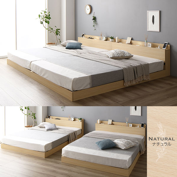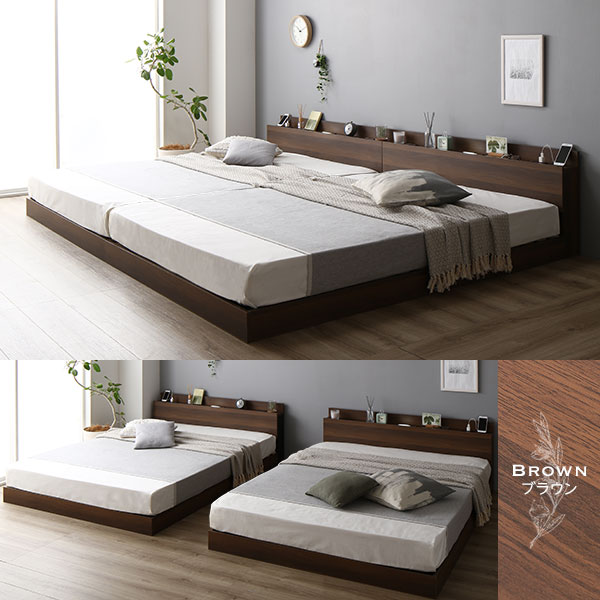 ベッド キング 180(SS+S) 国産ポケットコイルマットレス付き(ハード) ブラウン 低床 連結 照明 棚付 宮付 コンセント すのこ 組立品