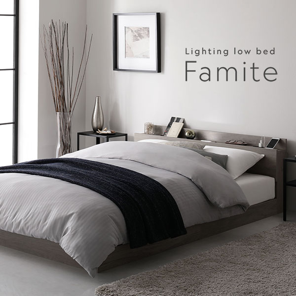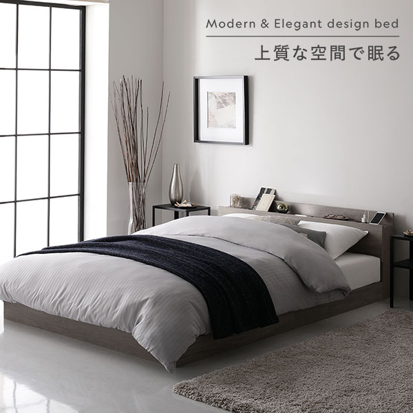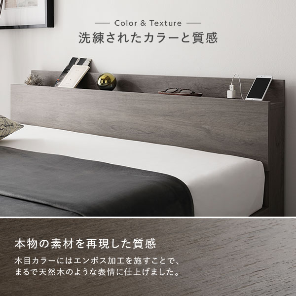 ベッド セミダブル 国産ポケットコイルマットレス付き(ハード) ストーングレー ローベッド 低床 ロータイプ すのこ 木製 LED照明付き 棚付き 宮付き コンセント付き 組立品