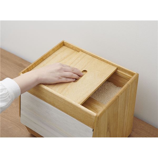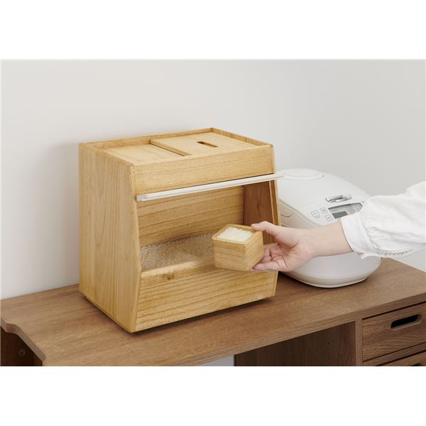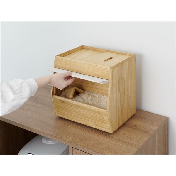 片手で簡単に開閉できるフラップ式扉採用。上部からお米を補充し前面下からお米を取るので古いお米がたまりにくい構造になってます。桐製の1合升付き。移動が楽な後部キャスター付き。