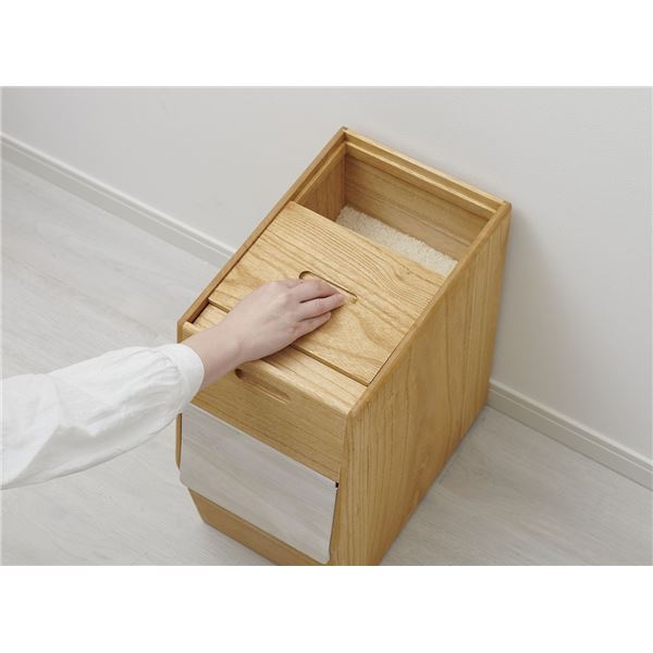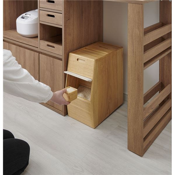 片手で簡単に開閉できるフラップ式扉採用。上部からお米を補充し前面下からお米を取るので古いお米がたまりにくい構造になってます。桐製の1合升付き。移動が楽な後部キャスター付き。