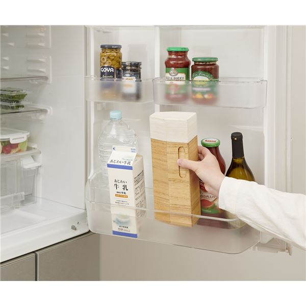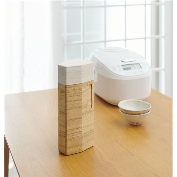 フタはお米を計れる計量カップとして使えます。(約1合)天然木桐製で軽くて女性でも扱いやすい。75mmスリムサイズでドアポケットに収まります。