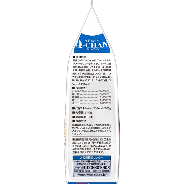 粗たん白質26.0%以上、脂質5.0%以上、粗繊維12.0%以下、灰分9.0%以下、水分10.0%以下