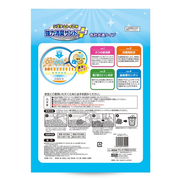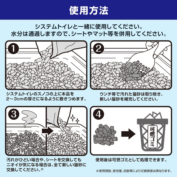 ・システムトイレのスノコの上に本品を2〜3cmの厚さになるように敷きつめます。ウンチ等で汚れた猫砂は取り除き、新しい猫砂を補充してください。