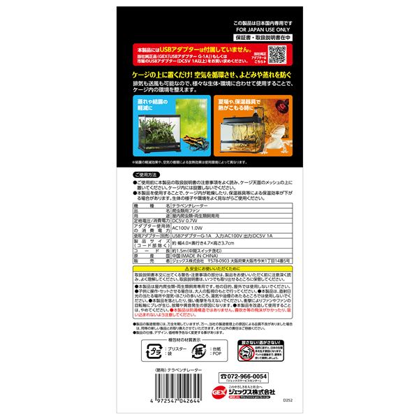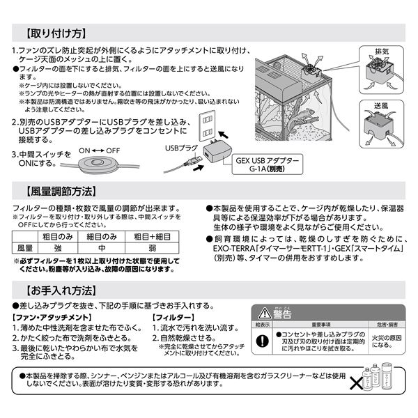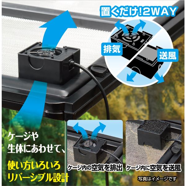 ・換気も送風も可能なので、様々な生体、環境に合わせて使用することでケージ内の環境を整えます。