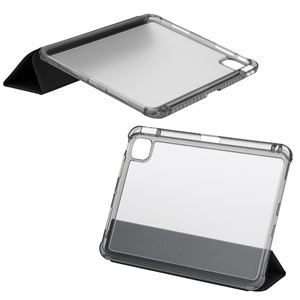 ●クッション性のあるTPU製のバンパーが衝撃を吸収します。内側は起毛素材で液晶画面を保護。背面パネルは艶消しクリア。Apple Pencilホルダーを収納した状態でiPad本体とペアリング、充電が可能。