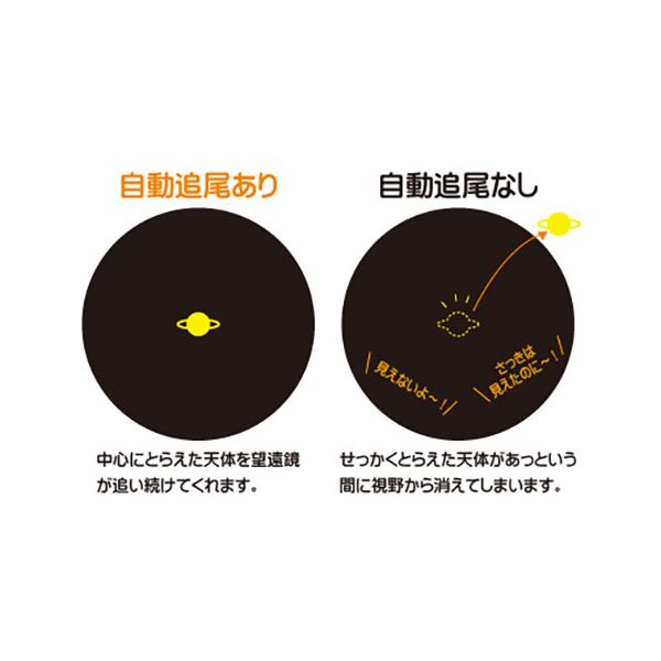 弊社の入門者向け天体望遠鏡では初めて自動追尾モードを搭載し、簡単な設定で導入した天体が視野から外れるのを緩和してくれます。天体は、地球の自転に合わせてゆっくりと動いています(約24時間で1回転)。従来の入門者向け天体望遠鏡では、時間の経過によって視野内から天体が外れてしまいますが、本製品では長時間の観測が楽に行えます。