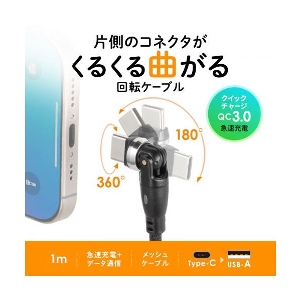 サンワサプライ USB2.0 Type-C-Aコネクタ540°回転ケーブル 1m KU-CAKA10BK