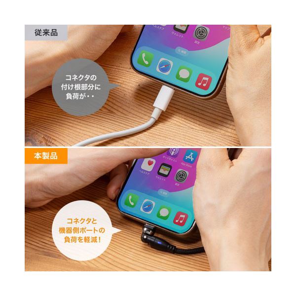 ●スマホやタブレットで充電しながら動画を見たり、ゲームをしたりする際にコネクタの向きを自由に調整でき、快適に使用できます。