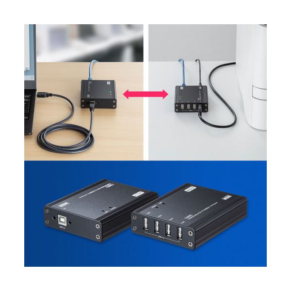 ●パソコンとUSB機器間を最大100mまで延長することができるUSB2.0エクステンダーです。