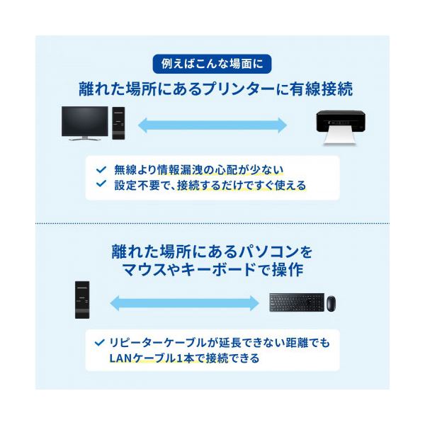 ●通常のUSBケーブル延長では届かない離れた場所に、USBカメラやスキャナ、プリンタなどを有線接続で接続したい場合に便利です。