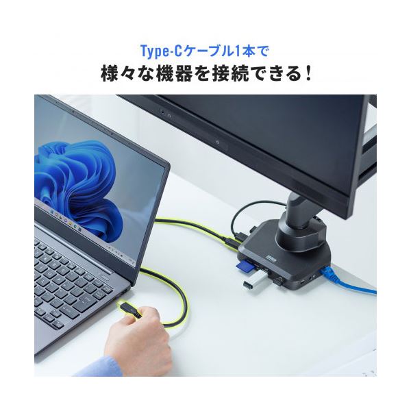●USB Type-Cケーブル1本でディスプレイ、各種USBデバイス、SD/microSDカードリーダー、有線LAN、USBオーディオの拡張接続ができる