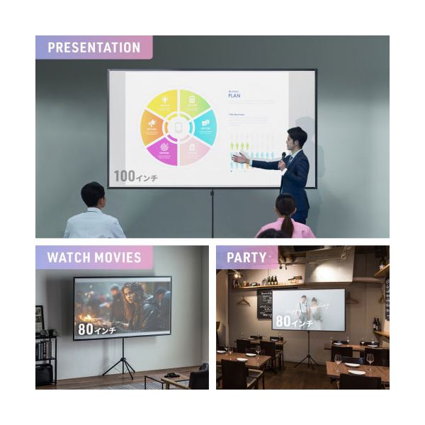 ●80インチワイド(16 : 9)サイズの大型プロジェクタースクリーンです。