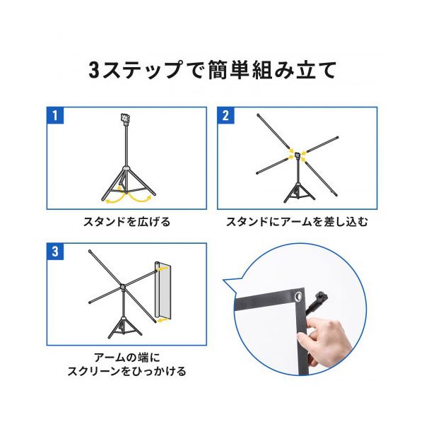 ●スタンドにアームを挿してスクリーンを取り付けるだけの工具を使用しない簡単組み立て設計になっています。