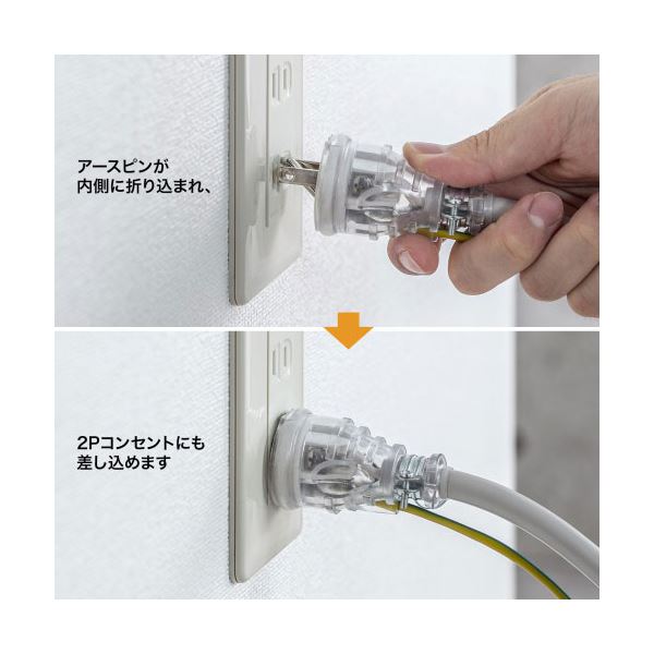 ●透明ポッキンプラグ採用。通常はアース付きの3Pプラグですが、二極コンセントに差込む場合は、アースピンがプラグ側に折り込むことが可能です。接地アダプタを使用せずに設置することができ便利です。