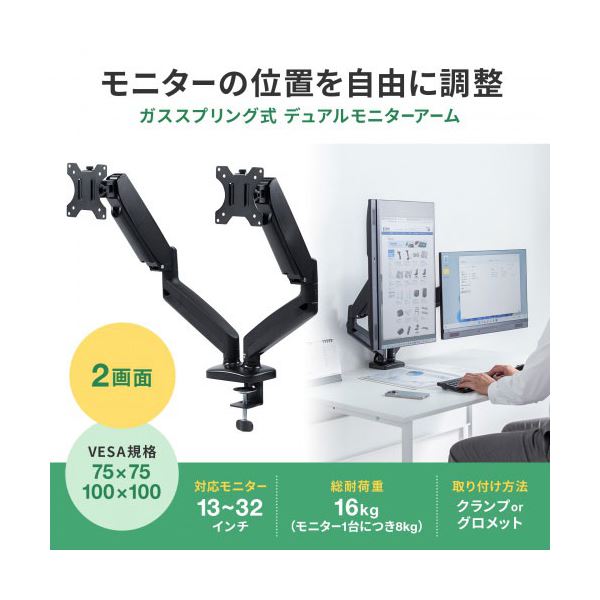 サンワサプライ モニターアーム ガススプリング式 デュアルアーム CR-LAC2405BK