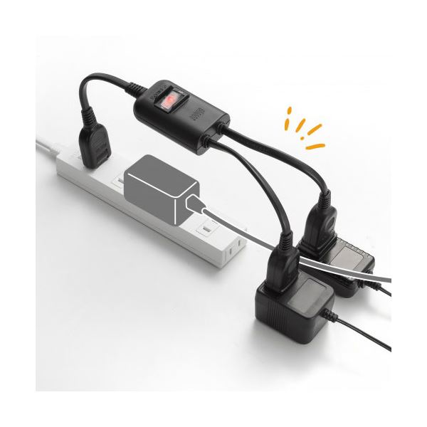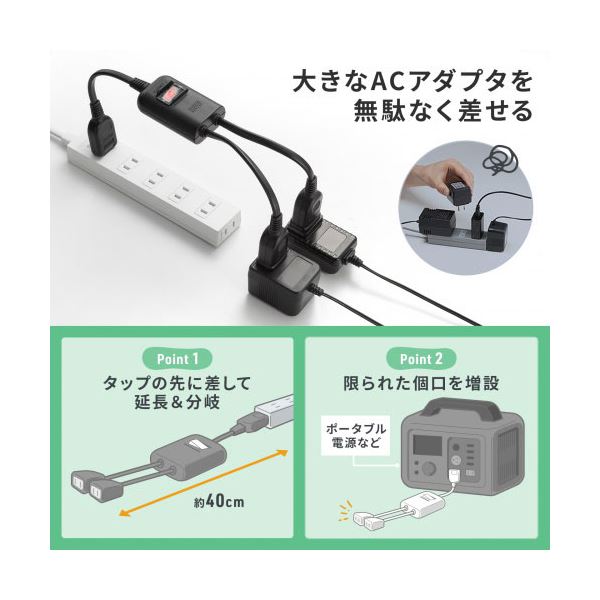 ●他の差込口をふさがないため、ACアダプタ使用時に無駄なく設置できる分岐タイプの電源延長コードです。