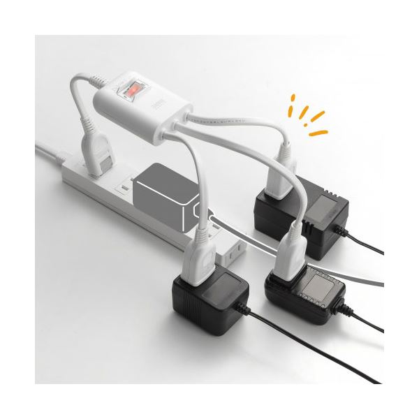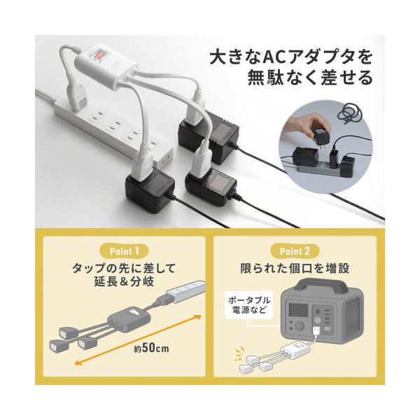 ●他の差込口をふさがないため、ACアダプタ使用時に無駄なく設置できる分岐タイプの電源延長コードです。