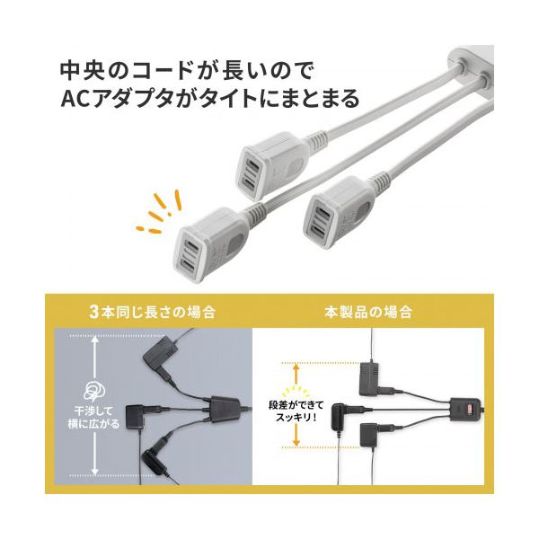 ●中央1本のコードが長く、ACアダプタが干渉しにくく差し込みやすい構造です。