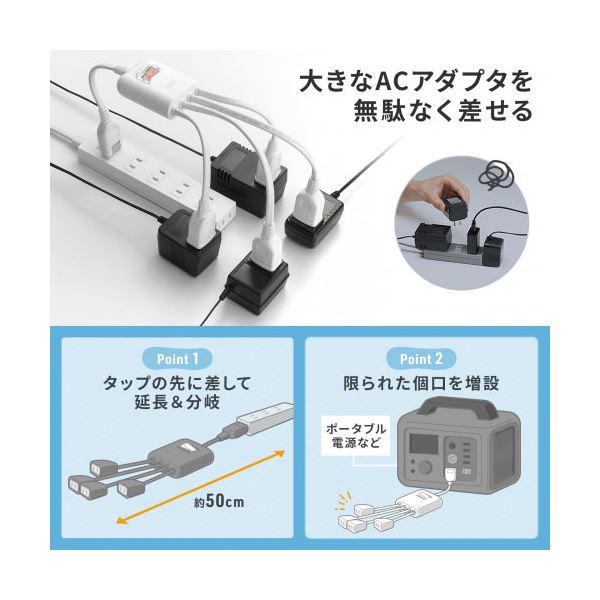 ●他の差込口をふさがないため、ACアダプタ使用時に無駄なく設置できる分岐タイプの電源延長コードです。