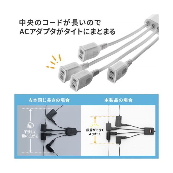 ●中央2本のコードが長く、ACアダプタが干渉しにくく差し込みやすい構造です。