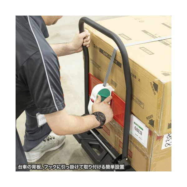 ●使用時は本体上部からフック付きベルトを引き出し、積荷の上を渡します。
