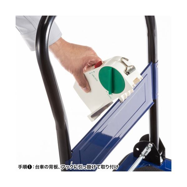 ●先端のフックを台車前側の縁に引っ掛けたらロックダイヤルを時計回りに回してベルトが緩まない様、張り具合を調整します。その位置で手を離せば自動的にロックが掛かります。