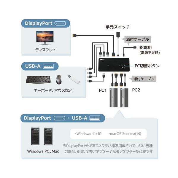 対応パソコン/OS : DisplayPortディスプレイ、USBキーボード・マウスの接続が可能なWindows 11、10/macOS Sonoma(14)