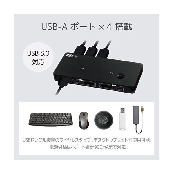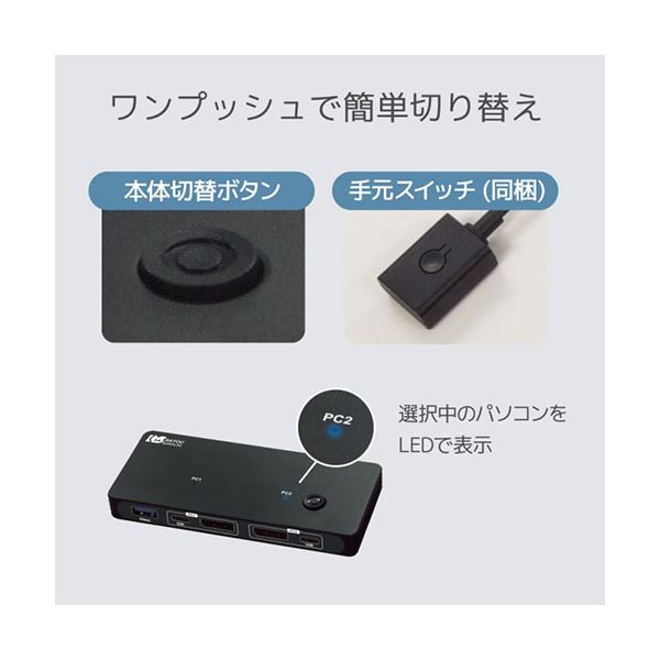 本製品は、DisplayPort端子とUSB端子が搭載されたパソコンに対応。異なるOSのパソコン2台(Windows PCとMac)でも使用でき、ボタンひとつで切り替えることができます。