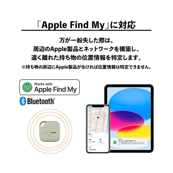 ・本製品は、GPS情報を暗号化してiPhoneやiPadなどのデバイスに位置情報を送信するという仕組みです。位置情報は暗号化され、個人が特定されることはありません。周辺にApple製品がなければ位置情報は更新されません。