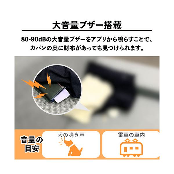 80-90dBの大音量ブザーをアプリから鳴らすことで、カバンの奥に財布があっても見つけられます。