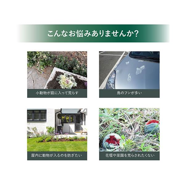 センサーで近づいた鳥や動物を感知して、70dBの大音量&夜間はLEDフラッシュで追い払う!