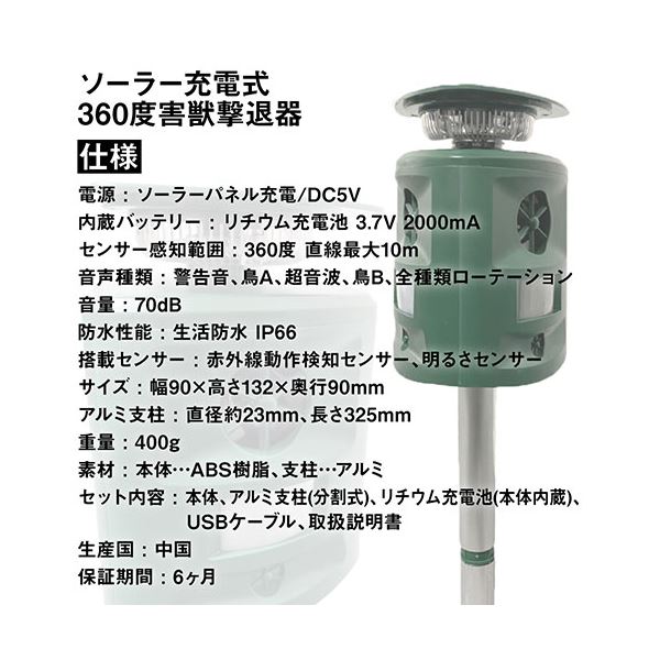 音声種類 : 警告音、鳥A、超音波、鳥B、全種類ローテーション