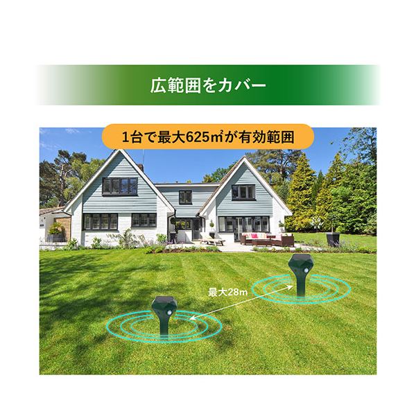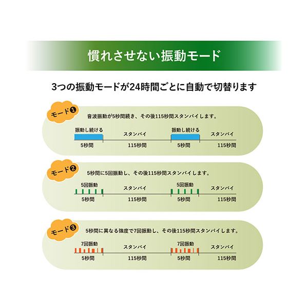 3パターンの音波振動を24時間ごとに自動で変更して、製品の半径14m以内に近づけさせません。