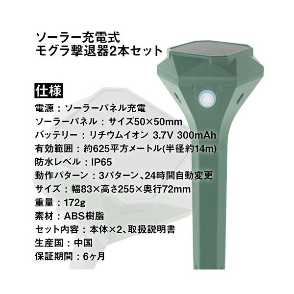 ソーラーパネルで日中たっぷり充電、撃退対象はモグラ、ネズミ、ヘビなど。