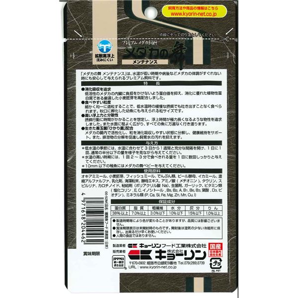 「メダカの舞 メンテナンス」は、水温が低い時期や病後などメダカの体調がすぐれない時にも安心して与えられるプレミアム飼料です。