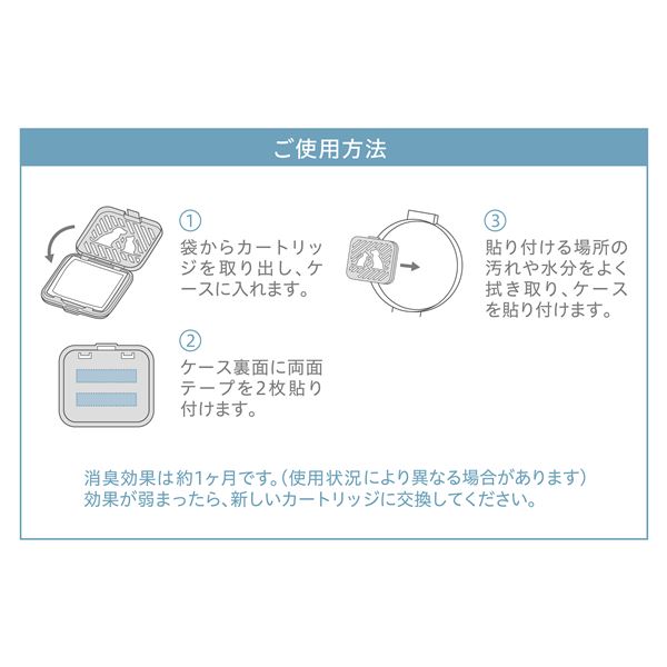 ・消臭効果は約1ヶ月です。(使用状況により異なる場合があります)効果が弱まったら、新しいカートリッジに交換してください。