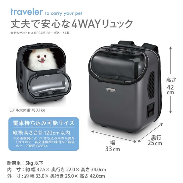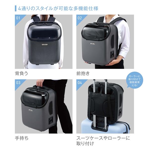 ・4通りのスタイル(背負う・前抱き・手持ち・スーツケースやローラーに取り付け)が可能な多機能仕様