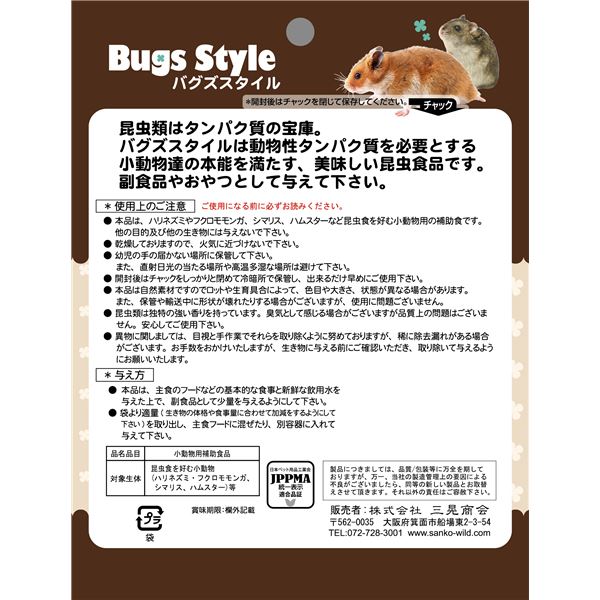 ・本品はハリネズミやフクロモモンガ、シマリス、ハムスターなど昆虫食を好む小動物用補助食です。他の目的及び他の生き物には与えないでください。