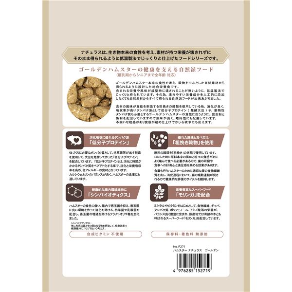 ・ゴールデンハムスター本来の食性を考え、穀物を中心とした自然素材から得られるように設計した総合栄養食です。