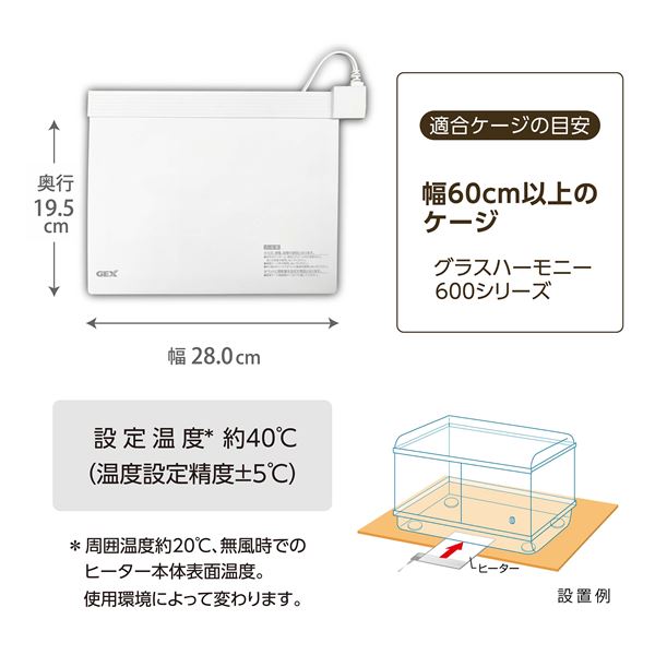 ・本製品の設定温度はヒーター表面の温度です。飼育環境に応じて、設置位置の温度を確認しながらご使用ください。