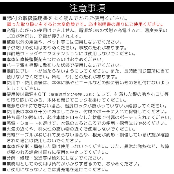 ※地肌にプレートが当たらないようにしてください。また、長時間同じ箇所に当て続けないでください。断毛・やけどの恐れがあります。