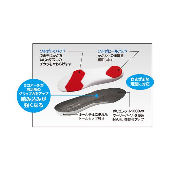 ● ソルボヒールパッド、ソルボトゥパッドがかかとへの衝撃や複雑なステップの時にかかるトルク(ねじれの力)の負担を軽減します。